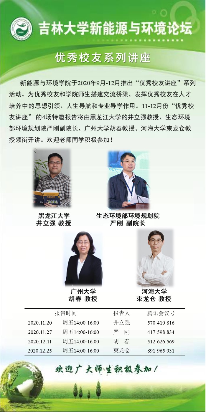 一色 于2020年9月-12月推出“优秀校友讲座”系列活动。为优秀校友和学院师生搭建交流桥梁,发挥优秀校友在人才培养中的思想引领、人生导航和专业导学作用。11-12月份“优秀校友讲座” 的4场特邀报告将由黑龙江大学的井立强教授、生态环境部环境规划院严刚副院长、广州大学胡春教授、河海大学束龙仓教授领衔开讲。欢迎老师同学积极参加!