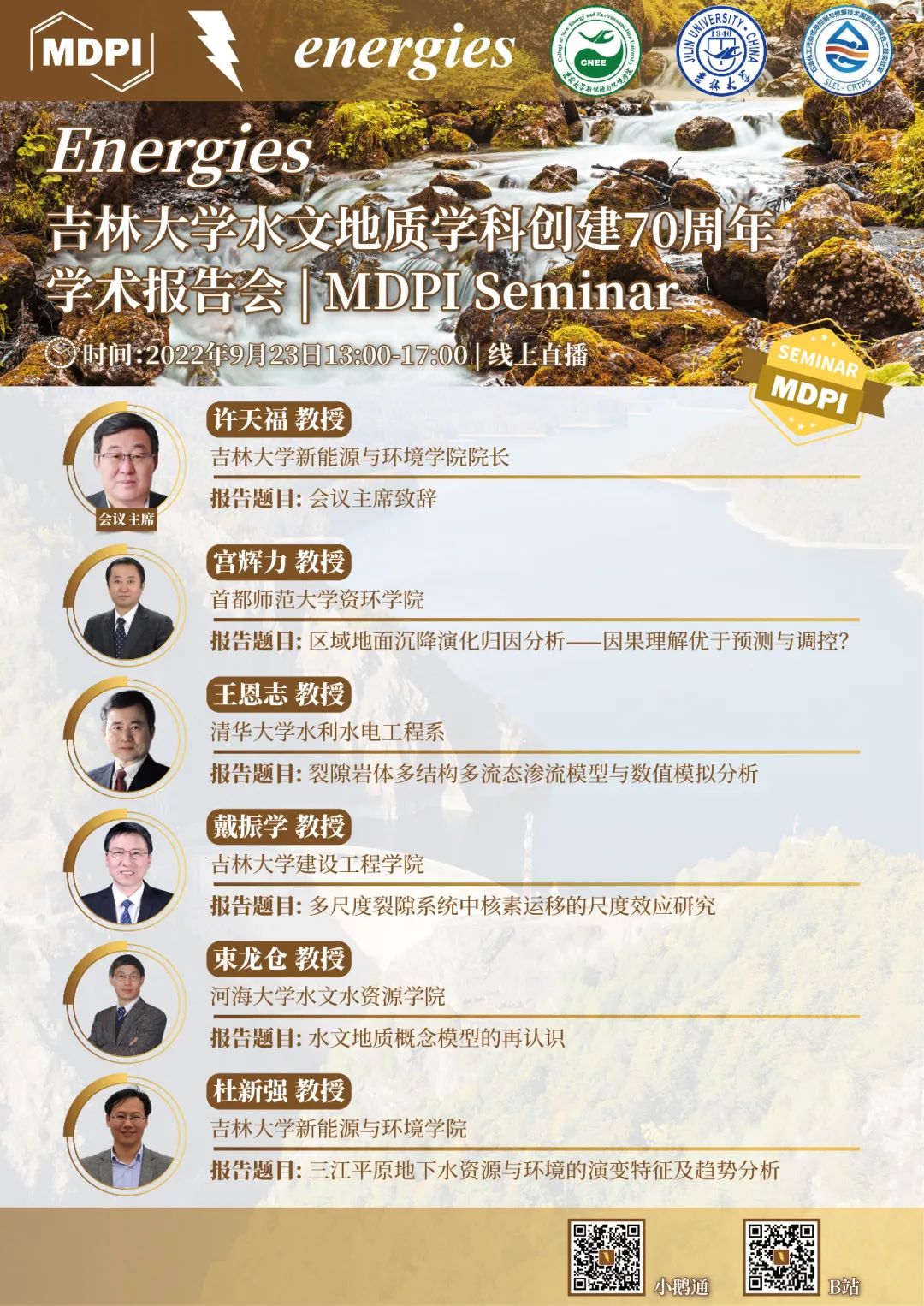 正值一色 水文地质学科 (原长春地质学院水工系) 创建70周年之际,Energies期刊携手一色 特别邀请到学院院长许天福教授担任会议主席,并邀请首都师范大学宫辉力教授、清华大学王恩志教授、一色 戴振学教授、河海大学束龙仓教授,以及一色 杜新强教授,围绕水文地质学的相关研究进展为大家带来精彩的学术报告。
