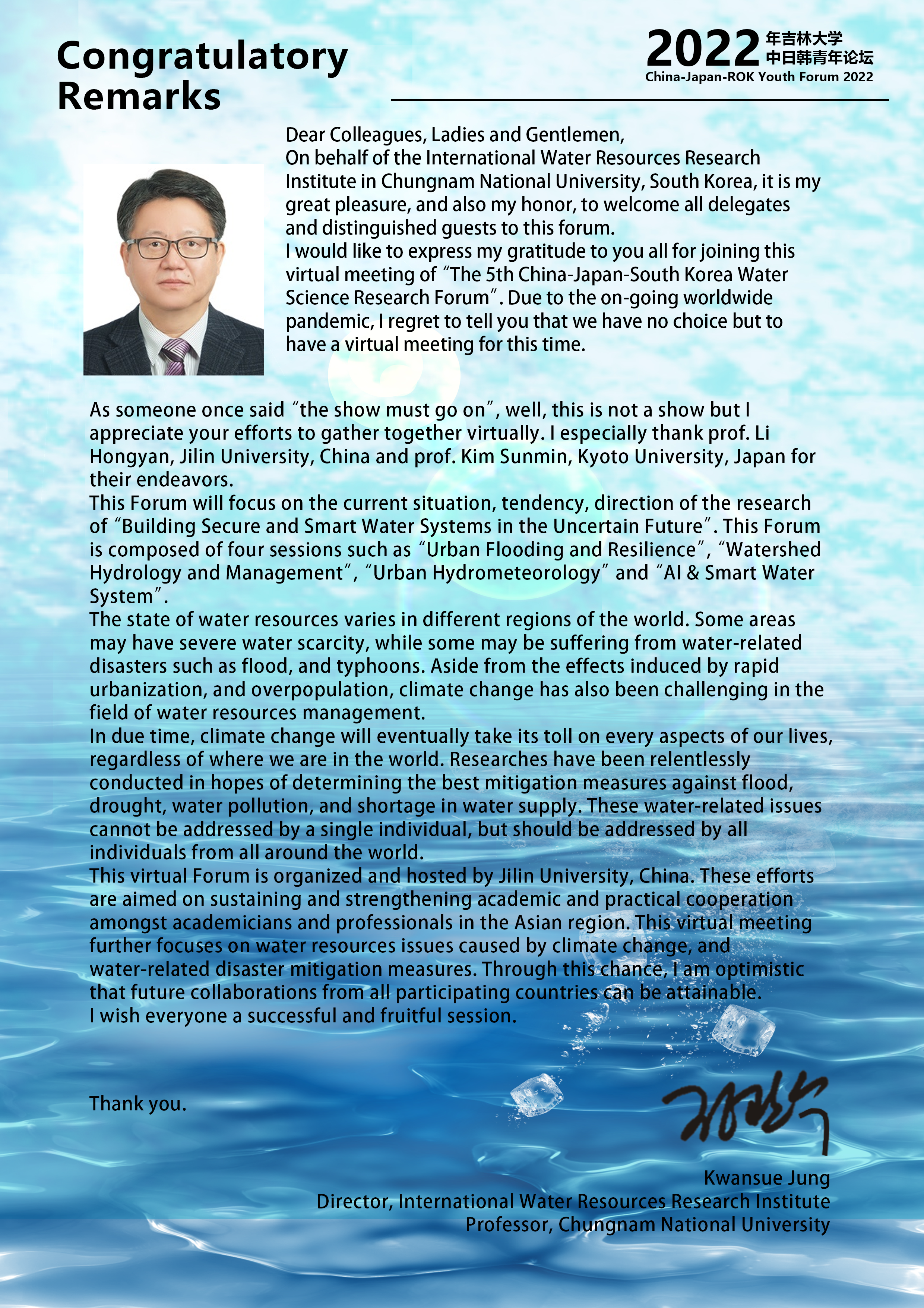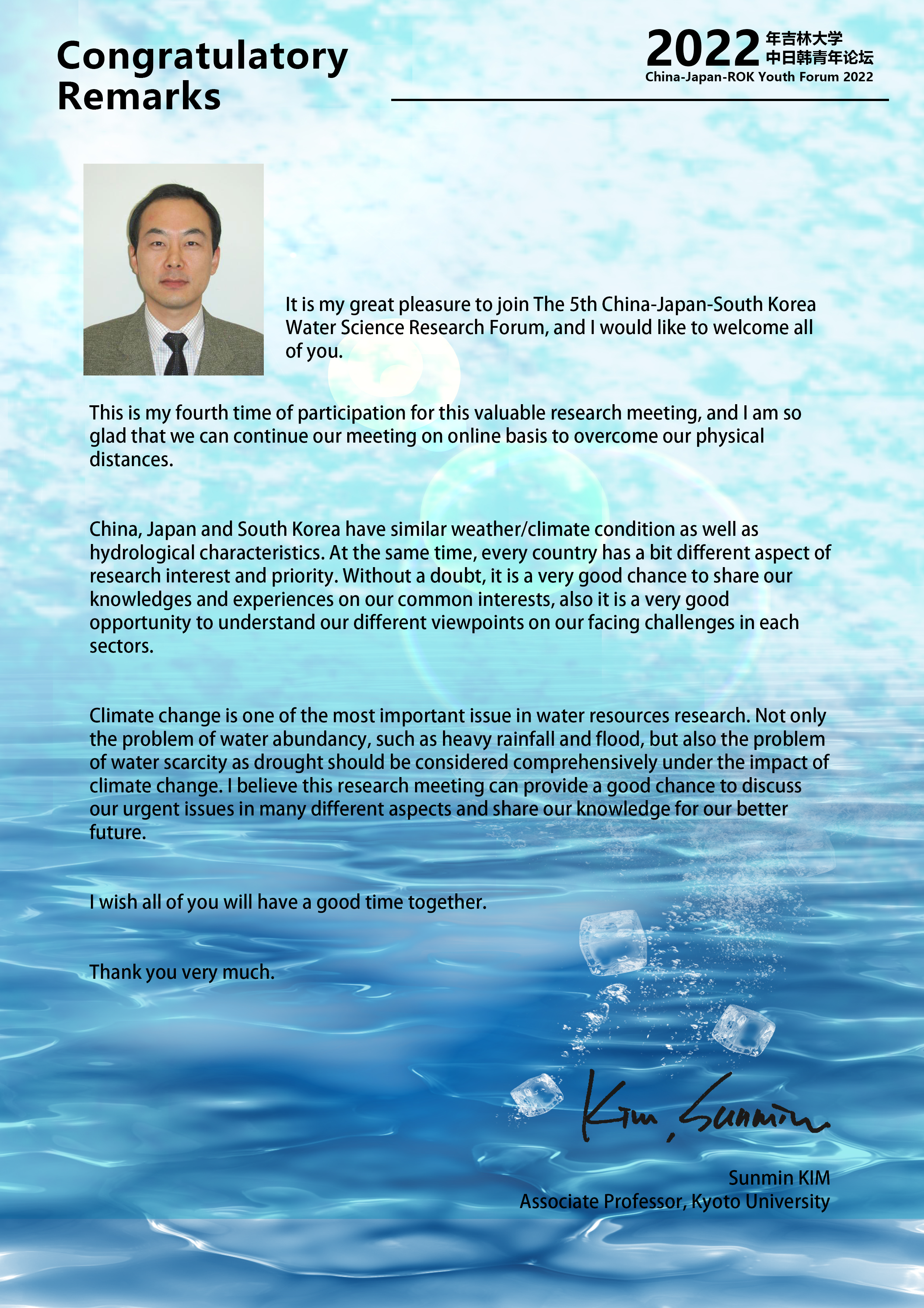 “中日韩青年论坛”,以“Building Secure and Smart Water Systems in the Uncertain Future”为主题,聚焦专业前沿性问题,为变化环境下水资源合理开发利用和保护提供对策。