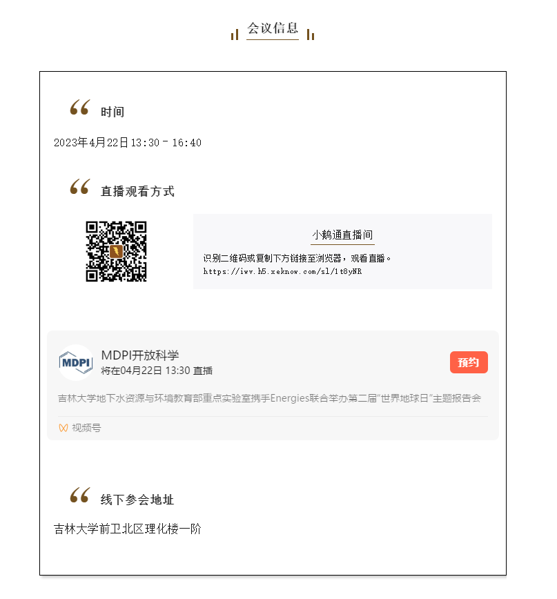 地下水资源与环境教育部重点实验室携手 Energies 期刊联合举办“世界地球日”主题报告会,就应对全球气候变化——“地质碳中和与地下新能源”相关领域的最新研究成果与应用进展为大家带来精彩的学术报告。本次研讨会开播时间为2023年4月22日13:30–16:40,欢迎大家积极参与!