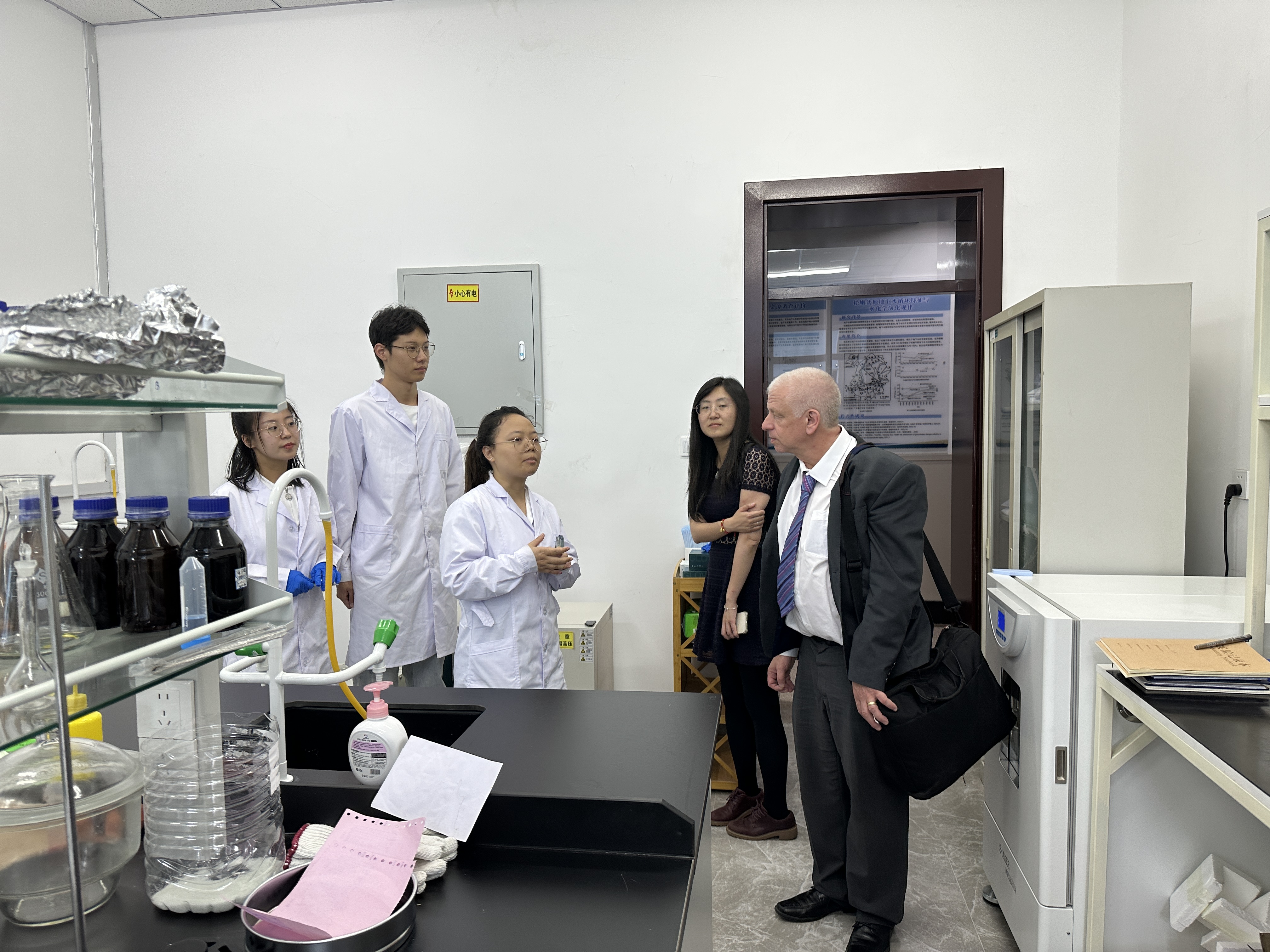 和曼彻斯特大学地球与环境科学系做了简要介绍。David Polya教授 以“Informing Country-Scale Groundwater Management Policies-Artificial Intelligence (AI) Modeling of Groundwater Arsenic Hazard and Attribute Cardiovascular Disease (CVD) in India 为题为学院师生做学术报告。张文静教授作题为“Pathogen migration in subsurface system: What we know or not?”的学术报告。最后,David Polya 教授和马琳研究员与学院教师们就地下水环境病原体迁移过程及相关机制以及二氧化碳贮存等专业领域进行了深入交流。座谈会后,代表团一行参观了学院本科教学实验室和科研实验室。