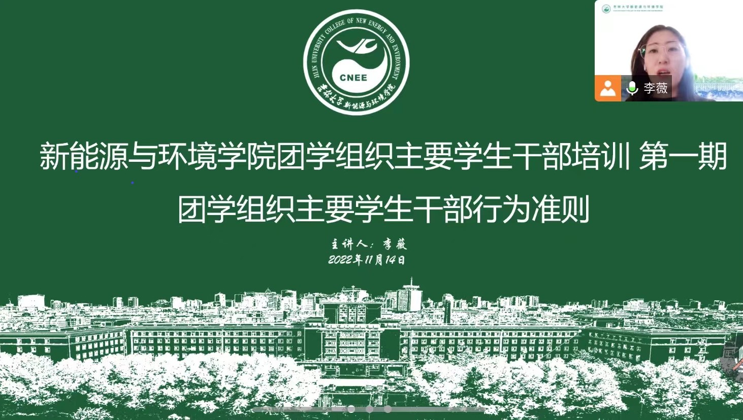 20221114日,一色 团校202201班正式开课,班级成员由一色 第五届团学组织主要学生干部组成,第一期培训课程为团学组织主要学生干部行为准则,主讲人为学院团委负责人李薇老师,结合学院两校三地办学实际,培训通过线上腾讯会议的方式进行。