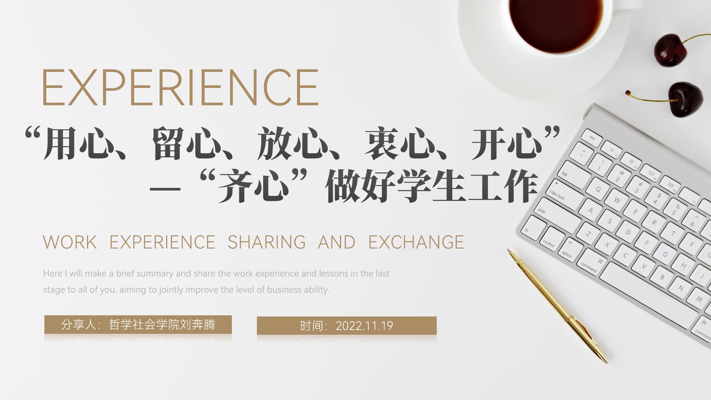 会上,刘奔腾同学表示学生工作给他带来了很多的体验和变化,认为丰富的学生工作使自己受益颇多。刘奔腾同学总结了个人从事学生工作的方法。从工作前反复调研出真知,工作中交流沟通出思路,工作后反思复盘出经验三方面进行讲解。呼吁各部门之间要相互理解,相互合作,携手共进,团学组织成员要时时刻刻牢记宗旨,由内而外的表露出全心全意为同学服务。