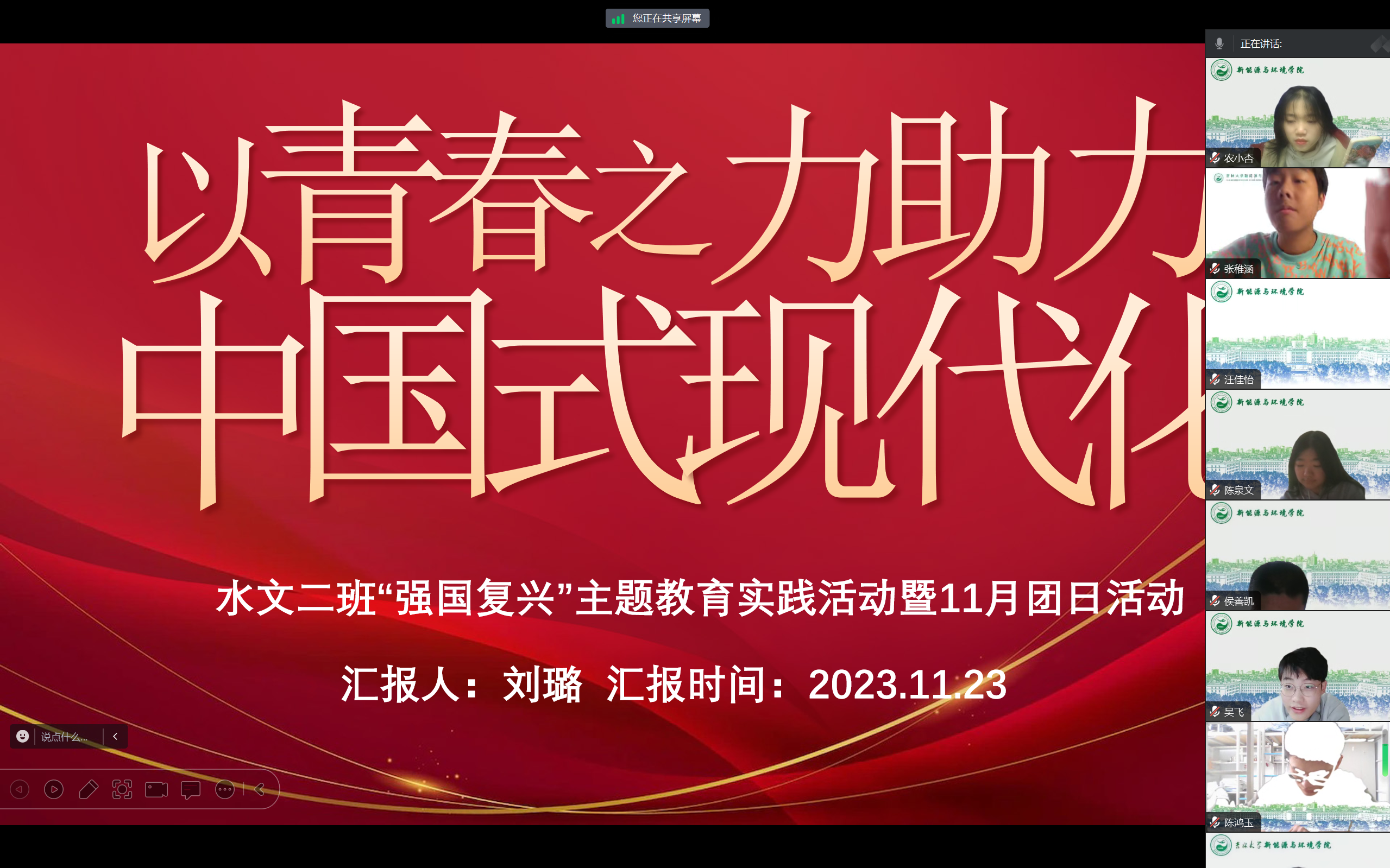 252226班的同学们在团支书刘璐的带领下,于腾讯会议线上召开了“强国复兴”主题教育实践活动暨11月团日活动,届时全体团员参会。本次团日活动的开展形式为集中学习讨论,采用“团员主讲,支书帮讲”的形式开展座谈会,提高同学们学习思考的积极性。