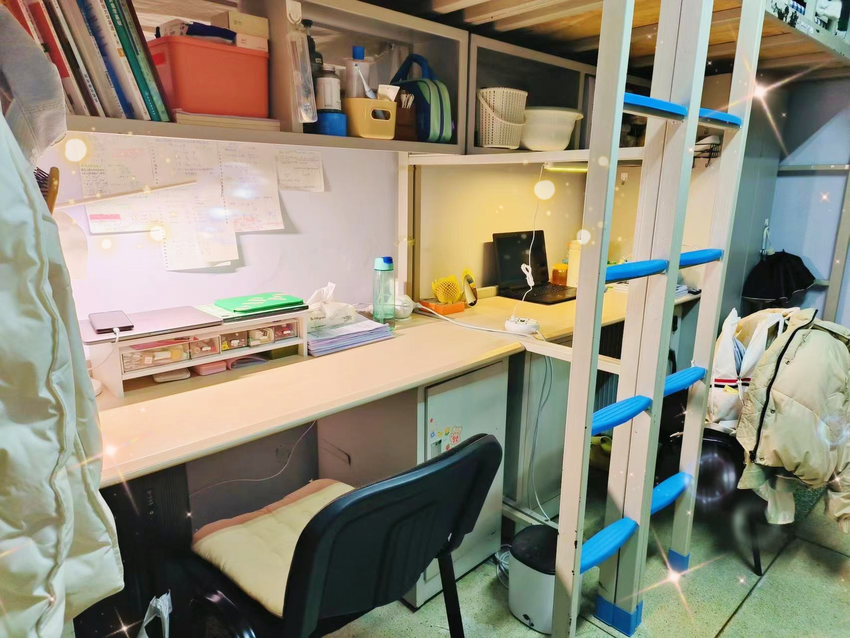 寝室介绍:抹去每一粒尘埃,抚平每一丝褶皱 ,整洁、规范是不变的坚持,文明,舒适是永恒的准绳。干净的地面,整齐的用品,平整的床铺,清新的空气......五公寓204的每一位寝室成员,无怨无悔,始终如一,用勤奋的汗水换来温馨的生活家园,用文明的素养营造浓厚的学习氛围。