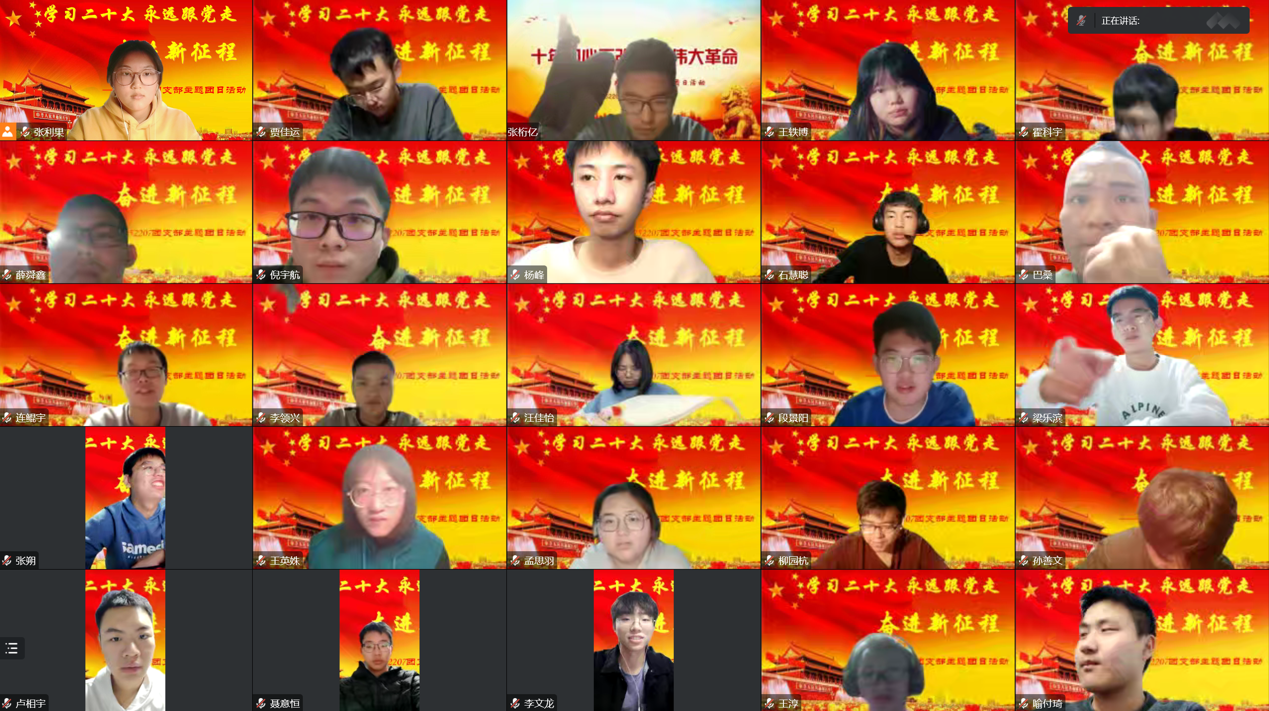 252207班团支部于11月26日晚七点在团支书张利果的带领下开展“学习二十大 永远跟党走 奋进新征程”暨青年大学习感悟交流会主题团日活动。此次活动共有包括团支部内24名共青团员在内的27位青年参加。