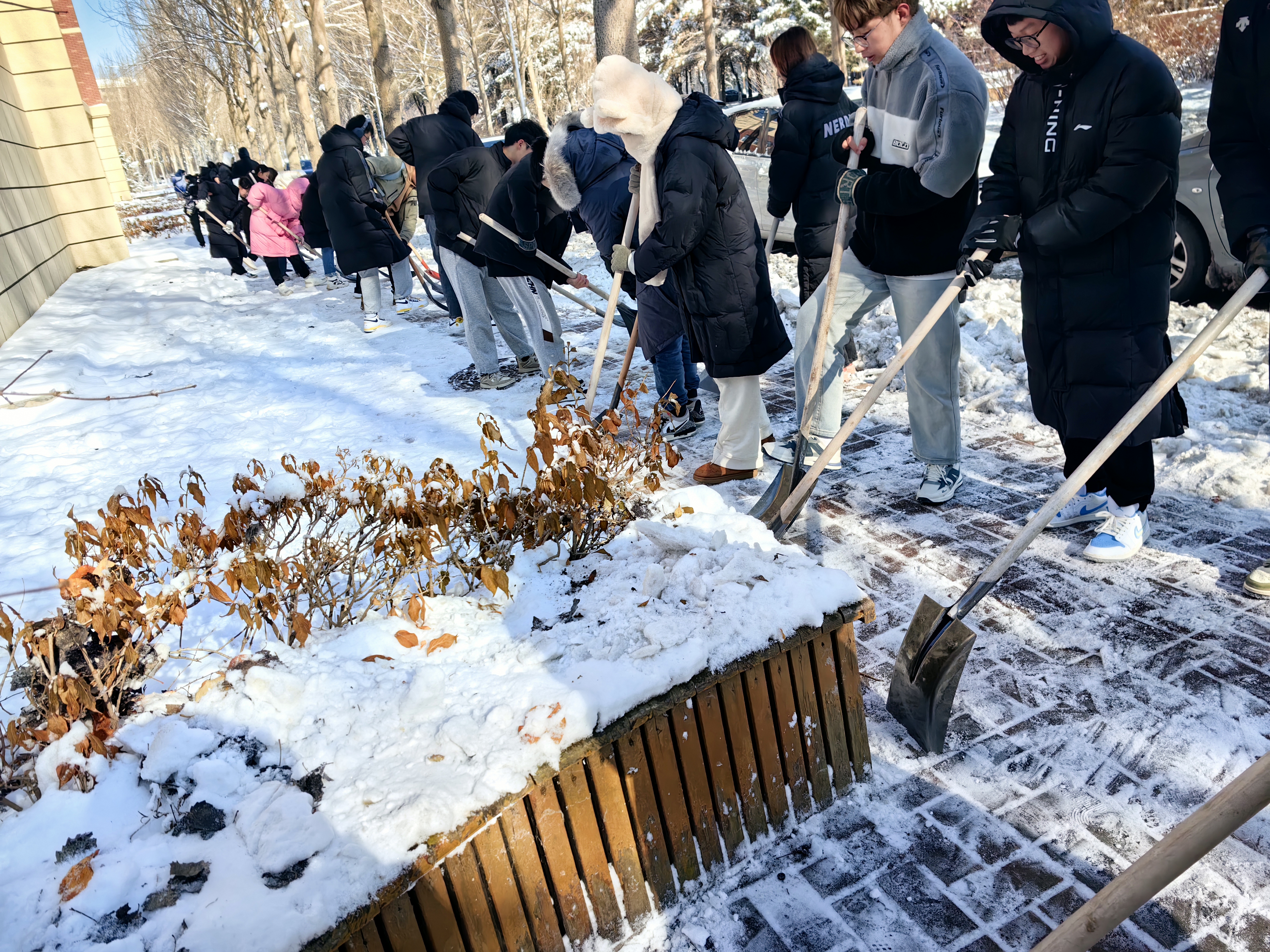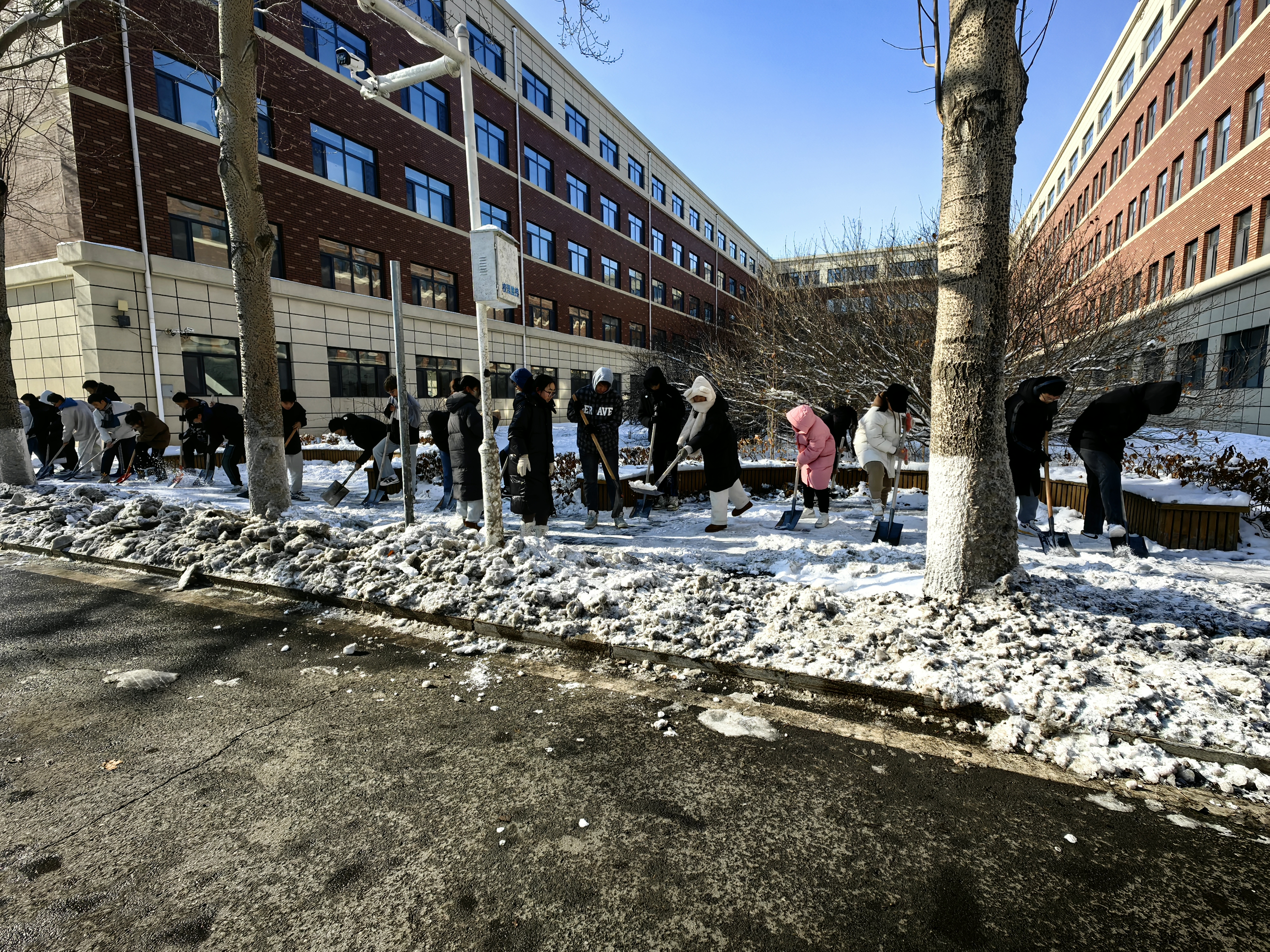 在辅导员姜岳彤老师的带领下,同学们有序地在指定地方集合,统一领取清雪工具,扫雪,破冰,除冰,有条不紊地进行清雪工作。大家分工明确,干劲十足,让艰苦奋斗的青春底色深刻融入到劳动实践中。