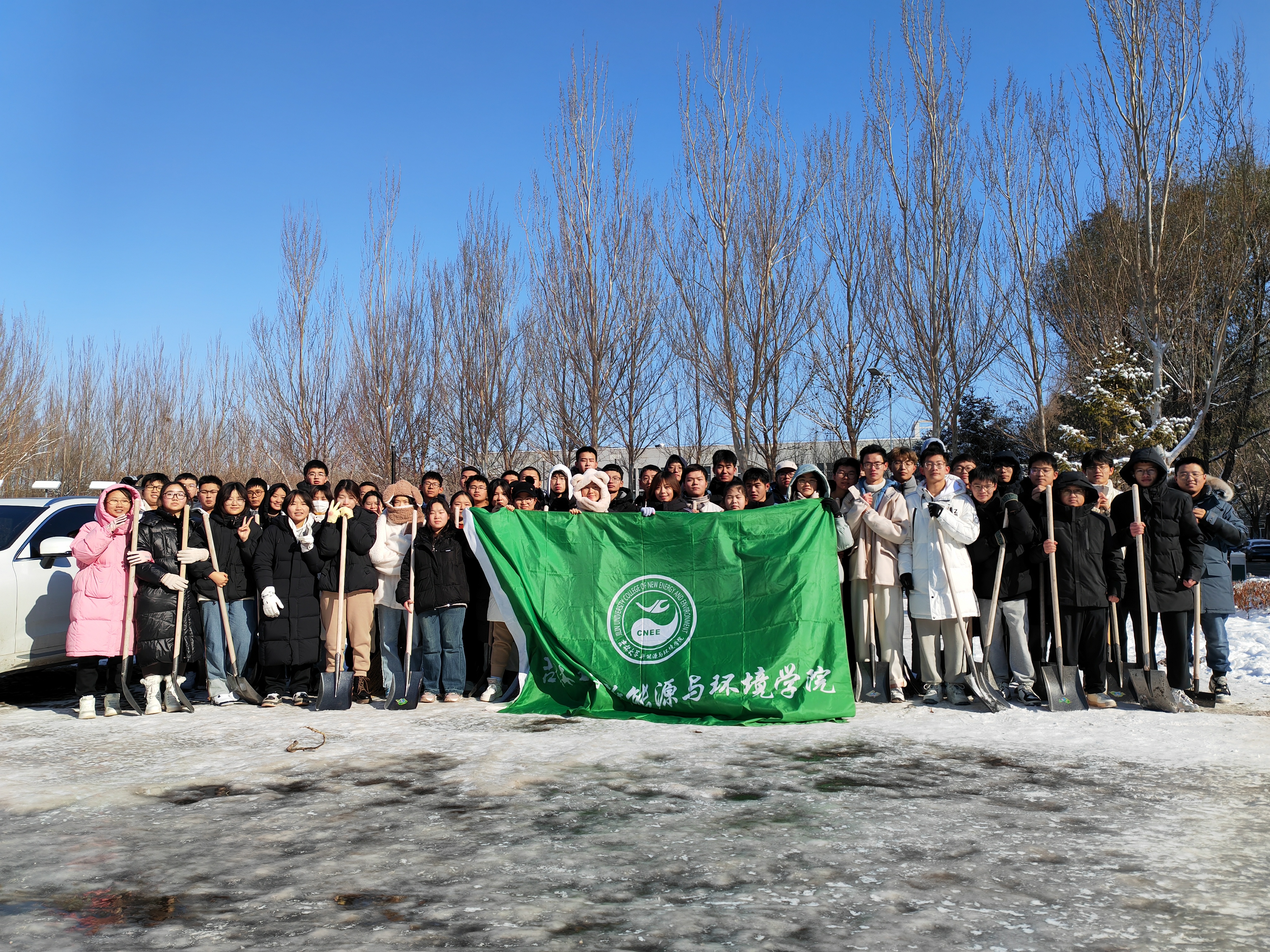 2023年11月7日,冬雪如约而至,大雪纷飞。同学们沉浸在雪的世界中,但积雪和结冰的道路给大家的出行带来了不便,为保障广大师生的出行安全,一色 2023级的同学们于11月10日星期二上午在敬信楼东侧进行了扫雪工作。