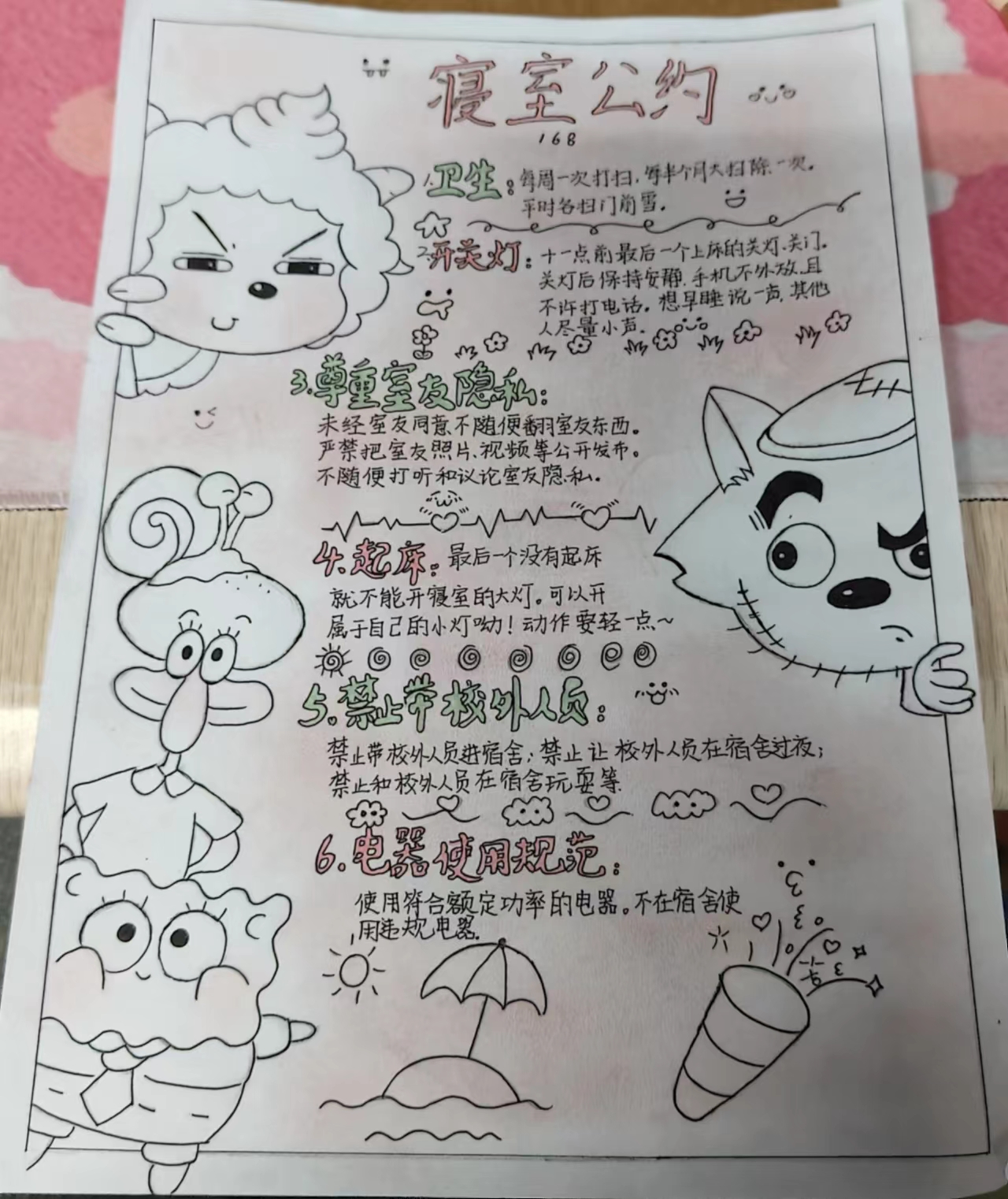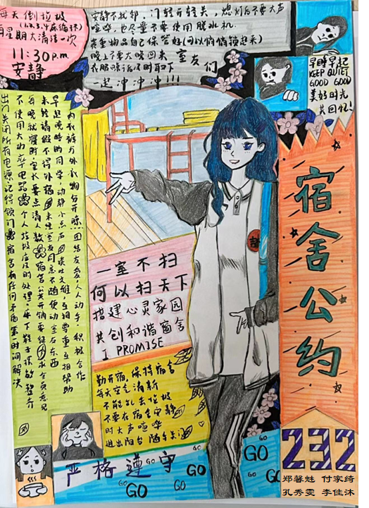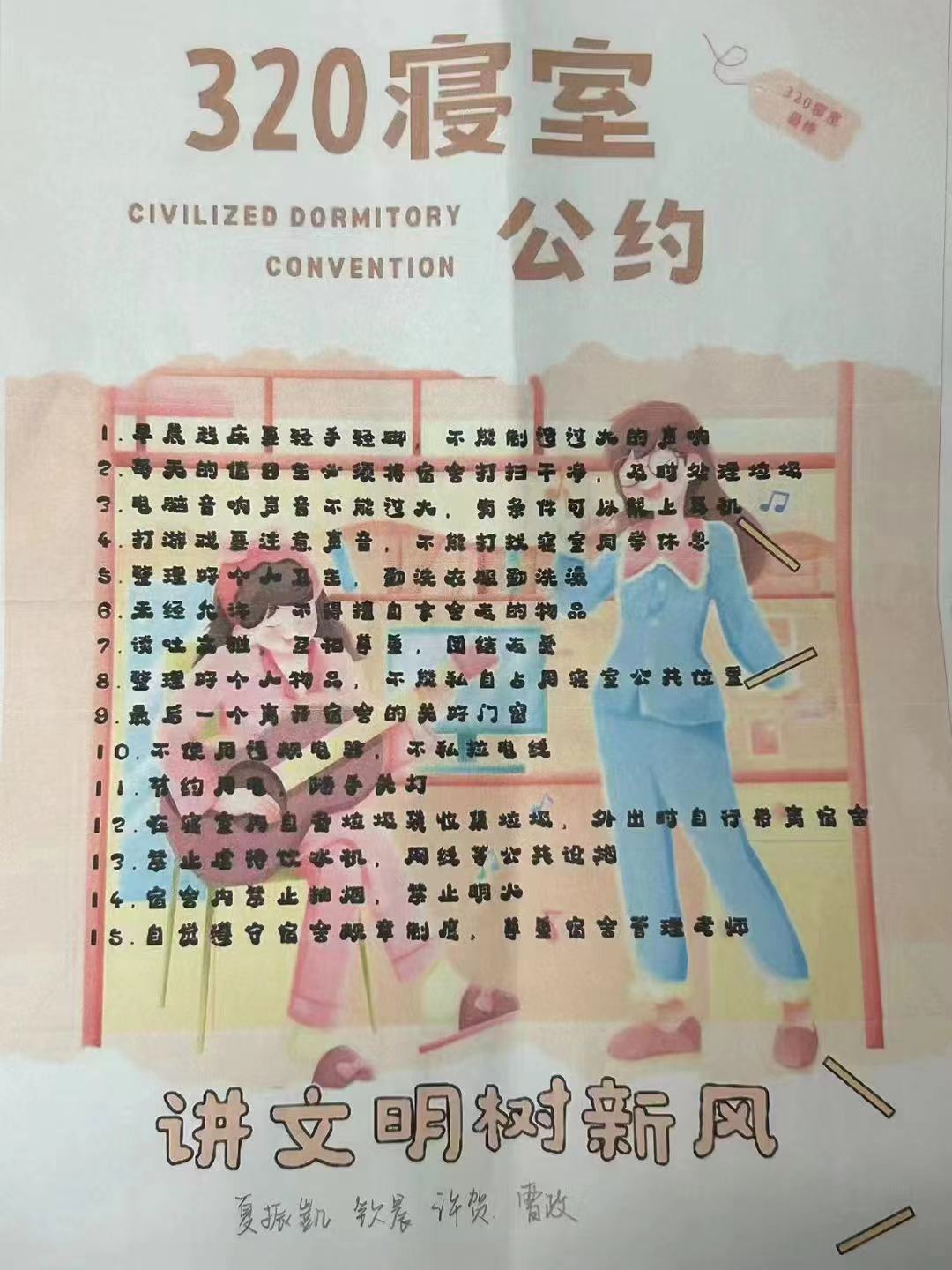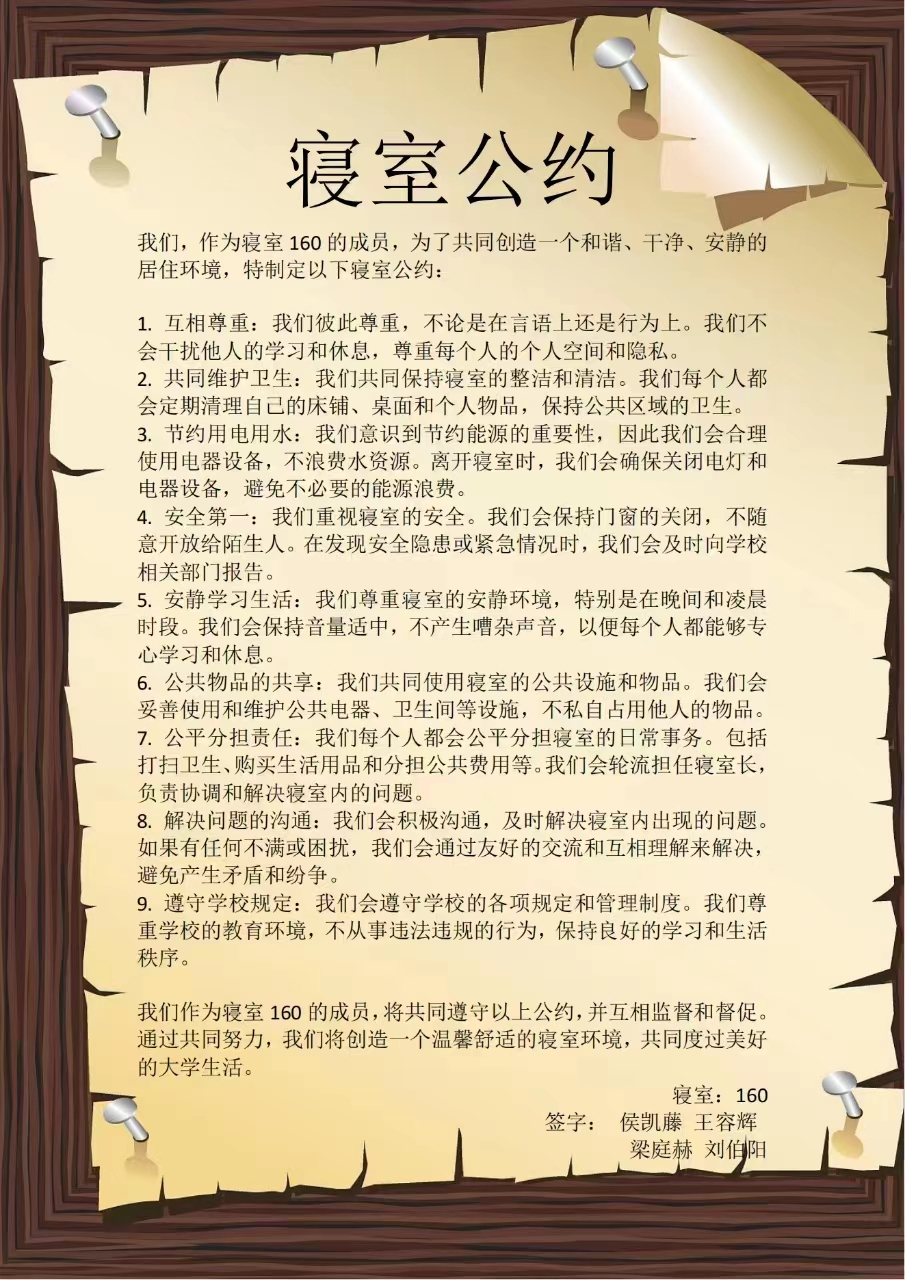 为进一步加强公寓文化建设,发挥公寓育人阵地作用,推动学生寝室制度化、有序化管理,引导学生养成良好的生活习惯,营造文明和谐、干净整洁的寝室文化氛围,一色 面向全体2023级本科生举办寝室公约创建活动,以多种多样的形式围绕宿舍卫生、校规校纪、学习氛围、作息时间等方面进行设计,涌现出一大批优秀的寝室公约。(以下排名不分先后)