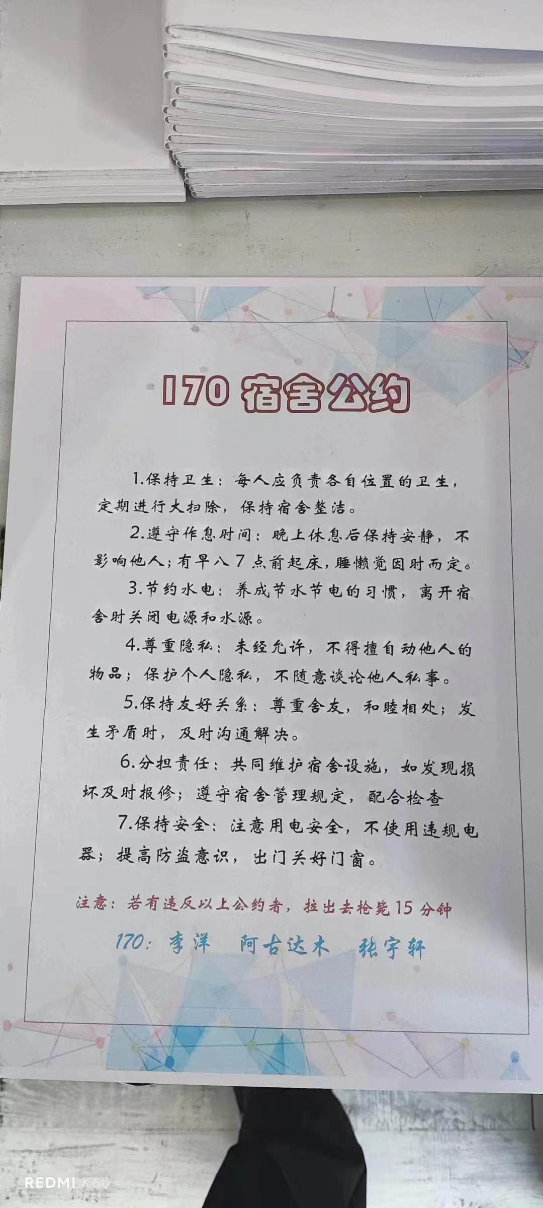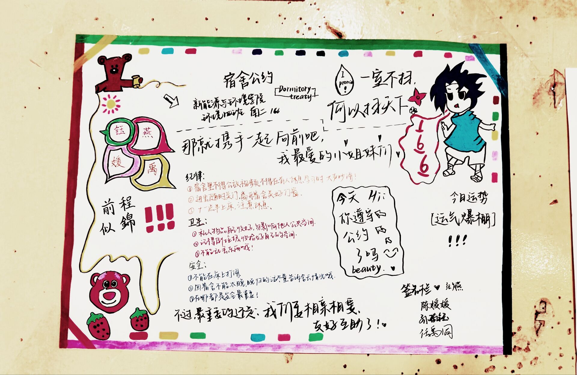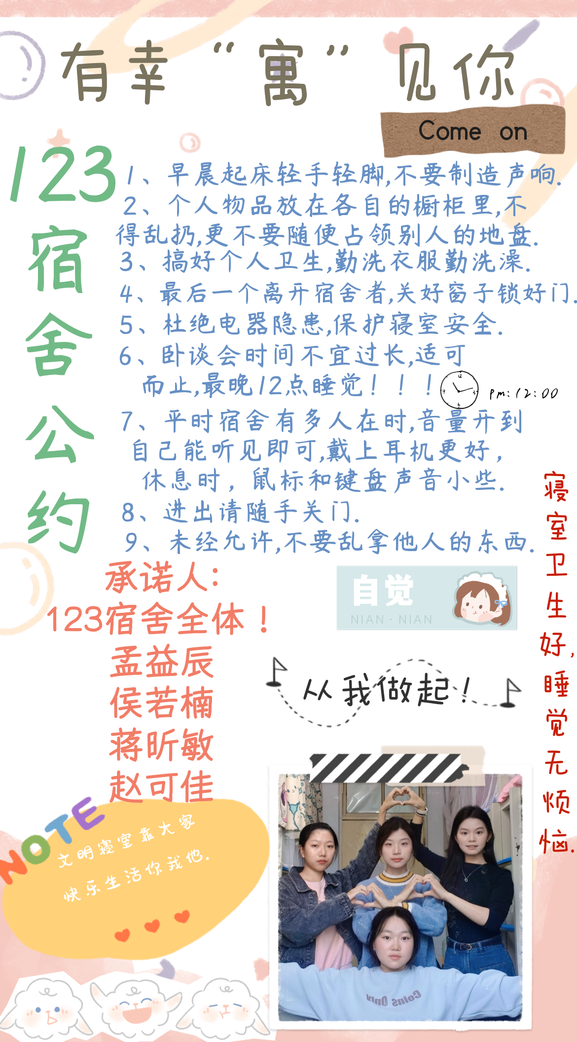 为进一步加强公寓文化建设,发挥公寓育人阵地作用,推动学生寝室制度化、有序化管理,引导学生养成良好的生活习惯,营造文明和谐、干净整洁的寝室文化氛围,一色 面向全体2023级本科生举办寝室公约创建活动,以多种多样的形式围绕宿舍卫生、校规校纪、学习氛围、作息时间等方面进行设计,涌现出一大批优秀的寝室公约。(以下排名不分先后)