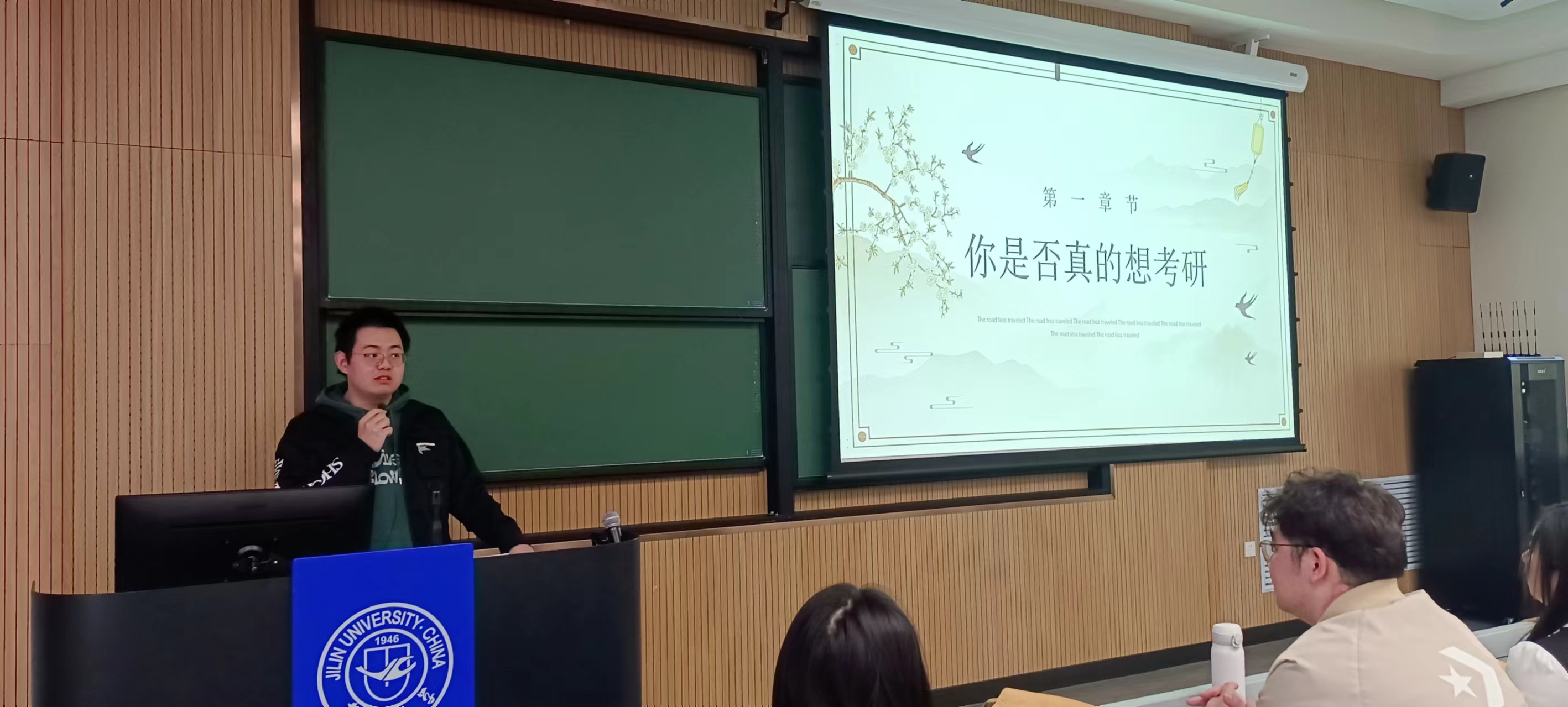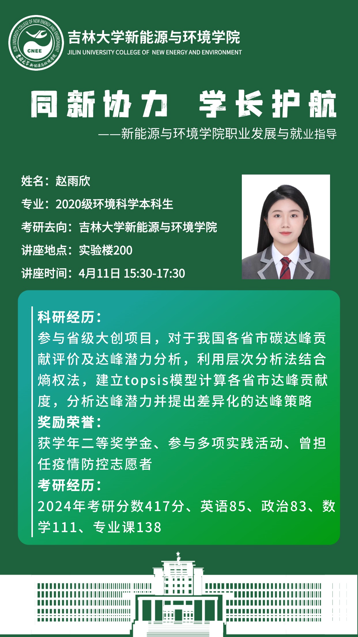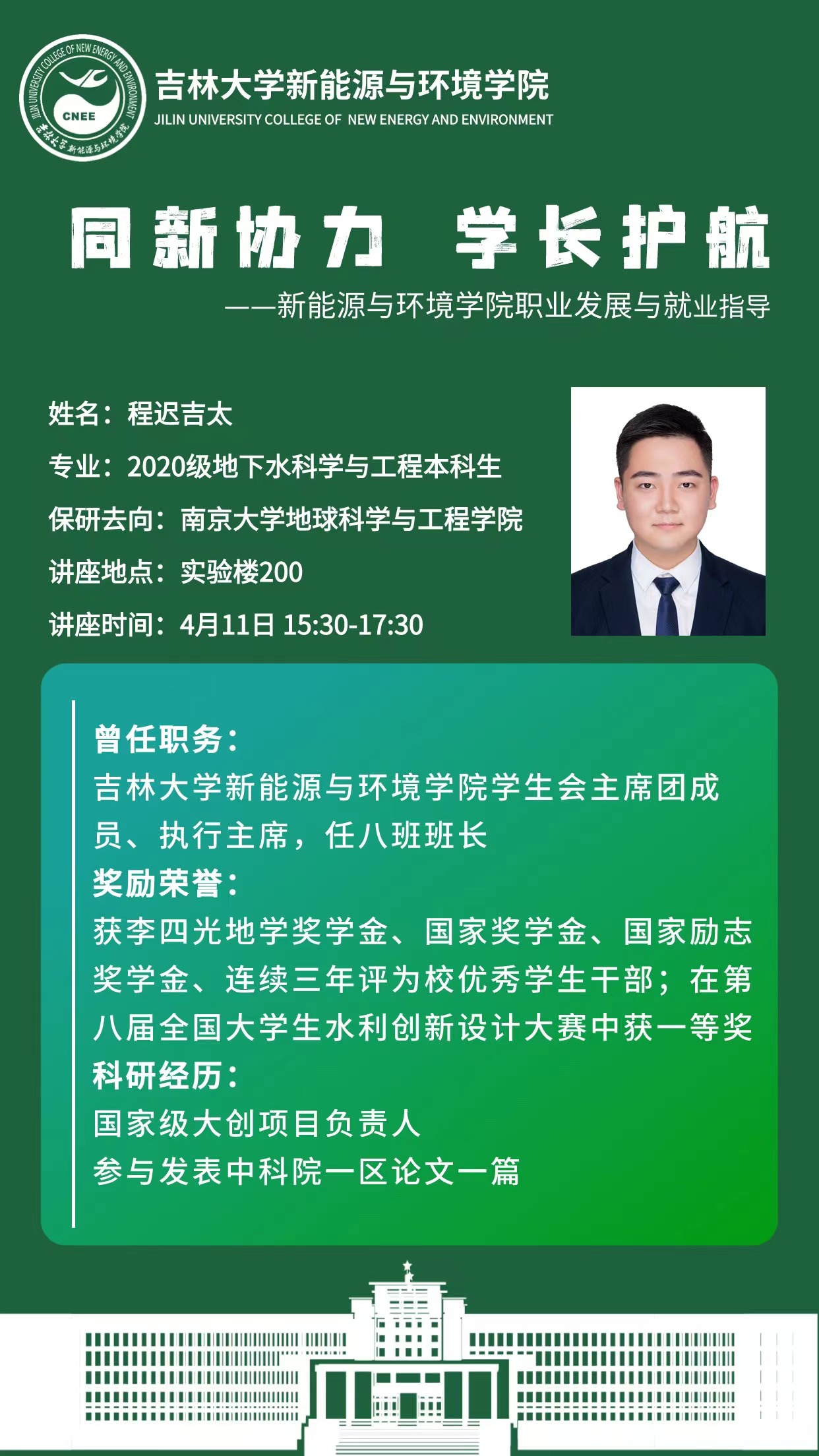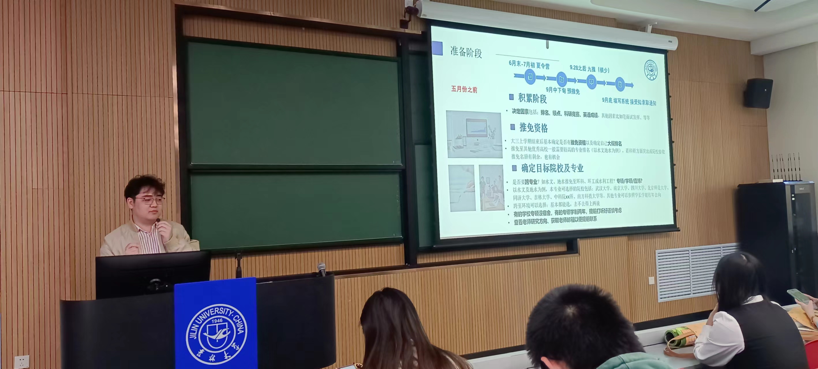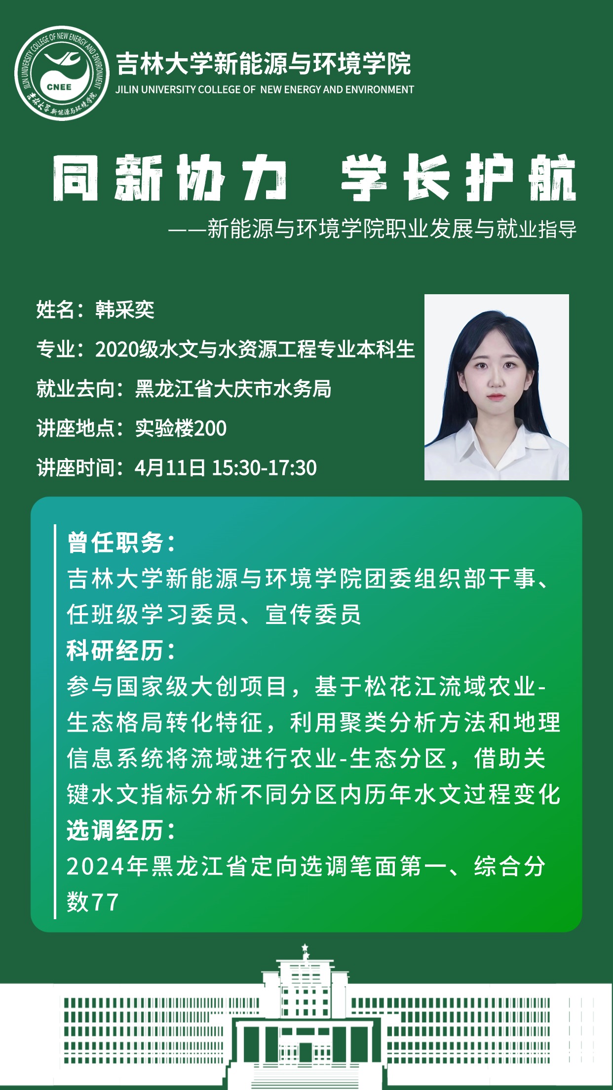 本次活动主讲人为四名2024年优秀应届毕业生。水文与水资源工作专业韩采奕同学在2024年黑龙江省定向选调考试中笔试、面试均列第一,成功上岸黑龙江省大庆市水务局;地下水科学与工程专业程迟吉太,于2023年成功推免至南京大学地球科学与工程学院;环境科学专业赵雨欣2024考研分数417分,为一色