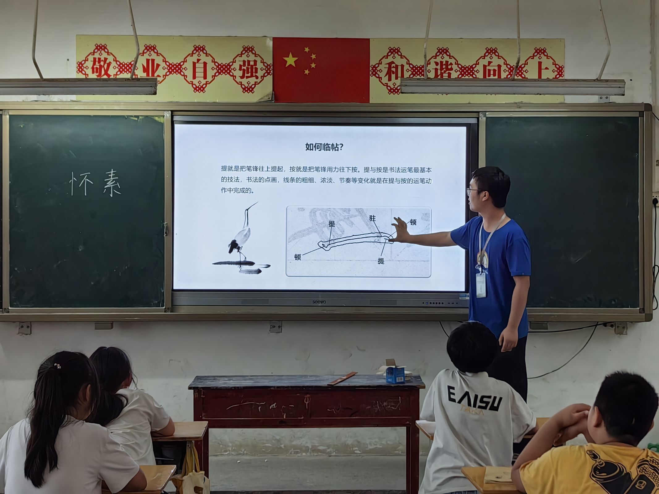 书法是一种独特的艺术形式,它通过线条和构图的变化,传达出情感、文化和美的信息。在书法课上,同学们首先学习了正确的握笔姿势和基本的笔画技法,然后开始练习书写简单的汉字。在这个过程中,同学们需要静下心来,专心致志地进行书写,以达到最佳的书写效果。课上,支教老师通过书法历史演变种类的讲述,列举每种书法名人故事,传授楷书和毛笔的学习技巧,向同学们讲述美,带领同学们鉴赏美。书法不仅是一门艺术,也是一种修身养性的方式,同学们通过书法课感受到中华文化的博大精深,体会文字之美,提高自己的审美情趣和文化素养,更好地通过书写表达自己的情感和思想。