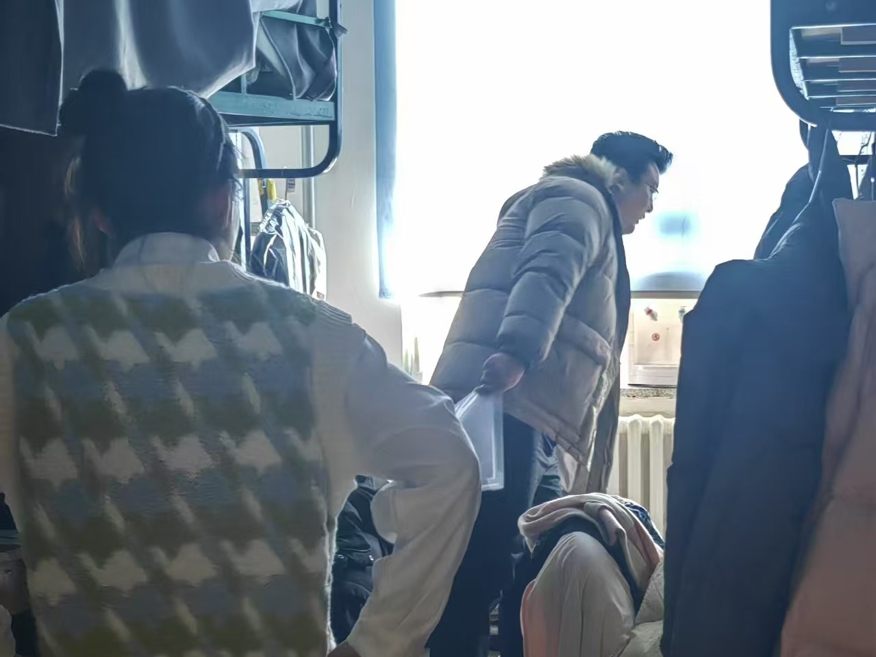 12月18日,2024级新生辅导员助理姜兆轩进入南苑一公寓学生寝室,了解寝室供暖情况,提醒同学们近期期末考试频繁,考试前要注意检查个人证件及考试用品是否携带完整。