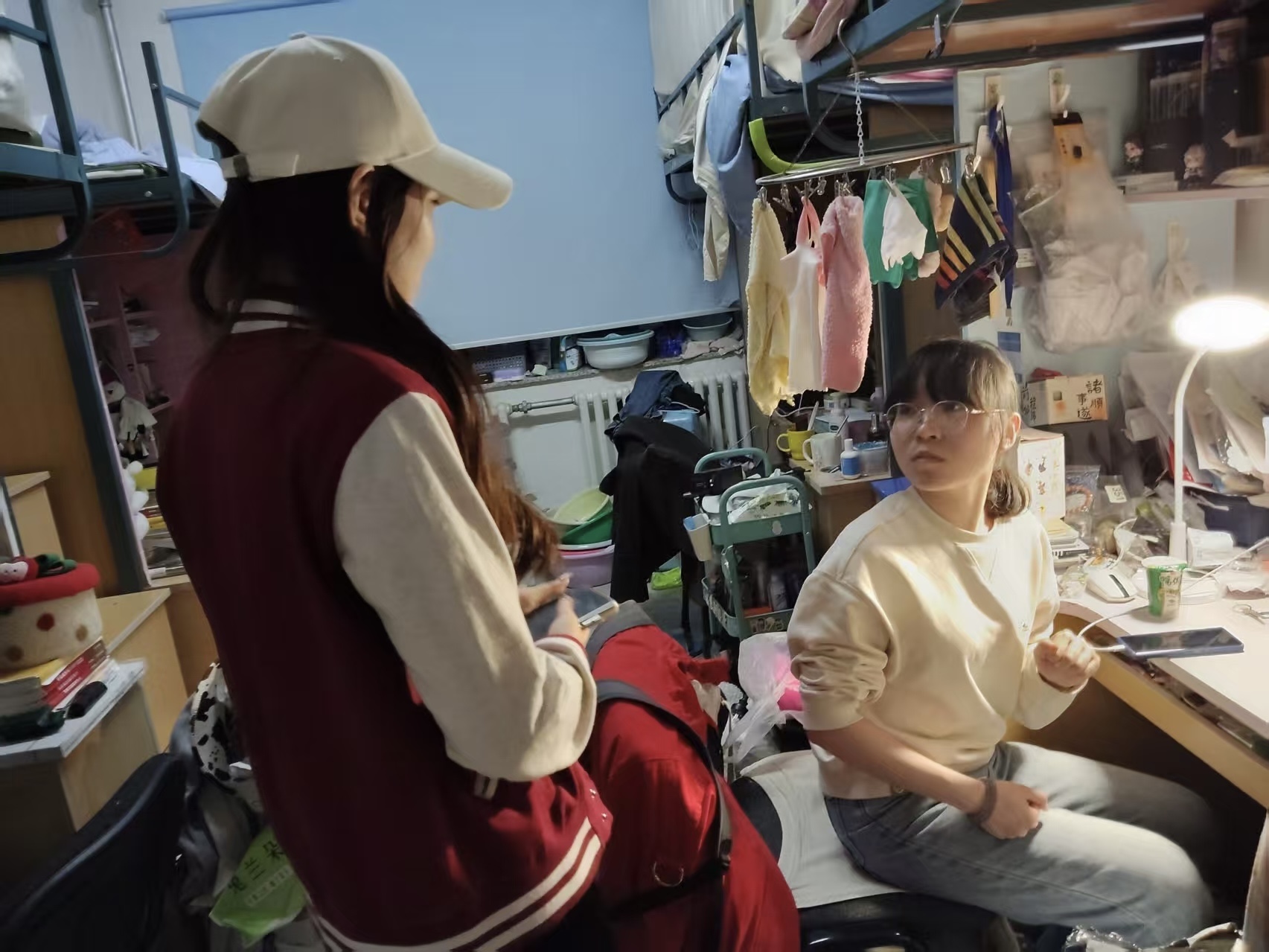 5月11日,2023级辅导员姜岳彤老师进入南苑一公寓学生寝室,检查宿舍卫生及违章电器情况,并提醒学生定期开窗通风,营造良好寝室环境。
