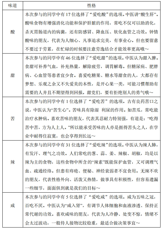 本次共100人参与进活动中,从卡片的答案中来看,在酸、甜、苦、辣、咸中,每一种味道都有最喜欢它的同学,也正是大家的不同让生活也变得多姿多彩。其实,从一个人平常喜欢吃什么味道的食物,也可以推知其性格的一二,下面附上不同味道对应的性格,大家一起来看一看准不准~