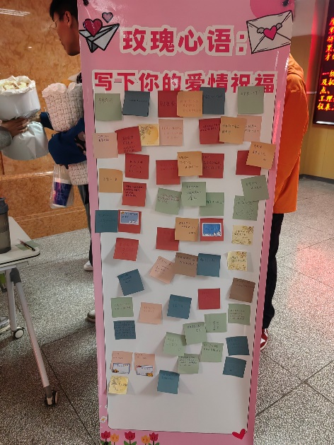 接下来的环节是弗洛伊德玫瑰赠送与祝福语征集,同学们在美丽的玫瑰花旁,写下对爱的理解与祝福,并将其挂在活动现场的“爱情祝福展板”上。现场氛围温馨而感人,大家纷纷表示希望在未来能够更好地理解自己和他人,将弗洛伊德的爱情观运用到日常生活中。