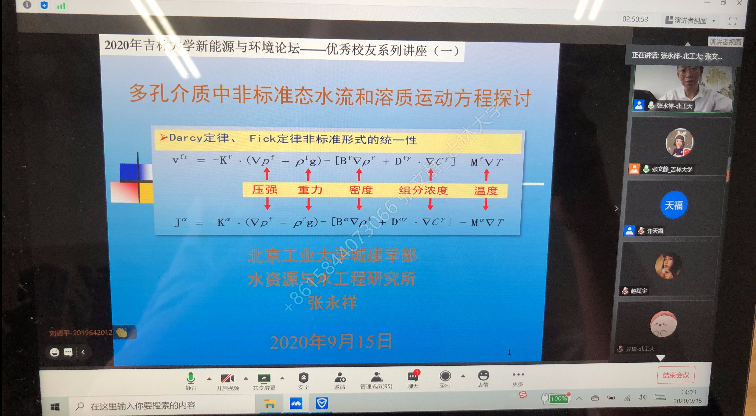 于2020年9月-12月期间,通过腾讯会议线上平台成功举办了本年度“优秀校友系列讲座”系列活动。本次活动每月开讲2次,共开展了8场系列讲座,分别由北京工业大学张永祥教授、清华大学王洪涛教授、中国石油大学曾溅辉教授、清华大学李广贺教授、黑龙江大学井立强教授、生态环境部环境规划院严刚副院长、广州大学胡春教授、河海大学束龙仓教授主讲,由许天福院长和院长助理张文静教授主持。