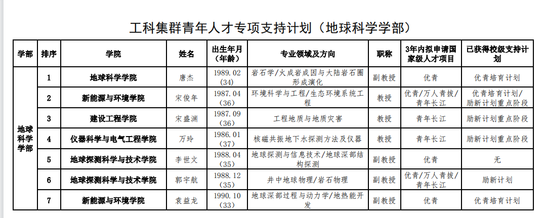 (地学部)工科集群青年人才专项支持计划评选结果公示