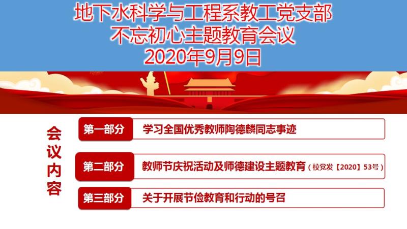 2020年9月9日下午,值第36个教师节来临之际,地下水科学与工程系教工党支部召开全体党员会议,会议采取钉钉网上会议形式举行。主要内容包括三个部分:1.集中学习全国优秀教师陶德麟同志的先进事迹;2.学习落实学校教师节庆祝活动和师德建设主题教育通知(党委教师工作部,2020年9月1日)的精神;3.关于开展节俭教育和行动的号召。