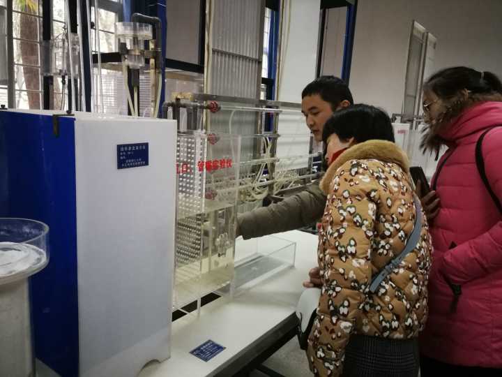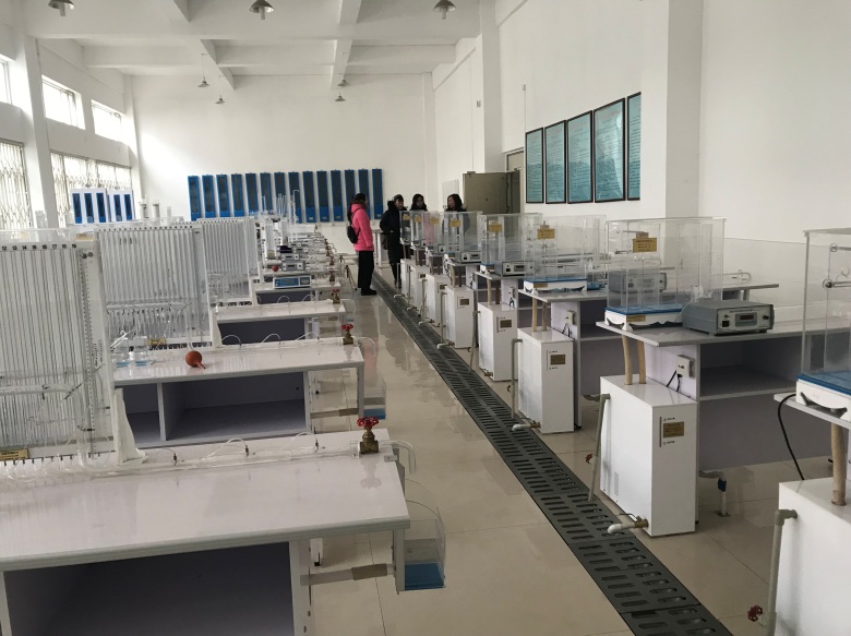 首先参观了四川大学国内一流的水力学与山区河流开发保护国家重点实验室(图1),该实验室是建设山区河流开发与保护领域具有国际引领地位的世界级开放性应用基础研究中心。该中心试验场地规模庞大,有循环水系统、陡槽系统、减压箱系统等,近年来共承担科研项目1501项,发表SCI论文680篇,授权发明专利176项。之后参观了四川大学水情自动测报系统实验室(图2),该实验室是我们专业认证缺欠的地表水实验室,该试验系统包括一体化水位、雨量监测站,管道流量监测站,分体式水位、雨量监测站及超短波水位、雨量监测站等设备。此外,还看到了水力学实验室(图3)仪器排水设施布局合理,排水槽深度设计规范,实验后排水通畅,为我们水力学实验室提供了改进排水问题的方案。