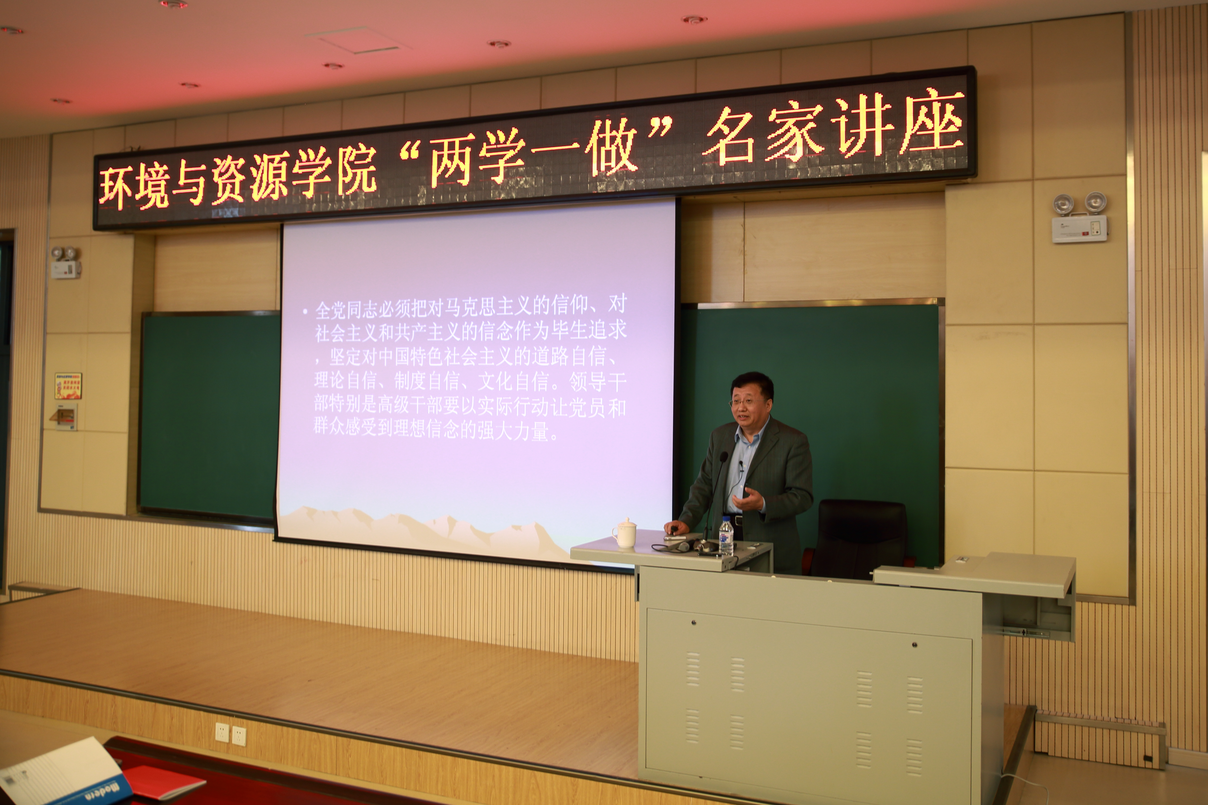 做题为“不忘初心,坚定理想信念”的“两学一做”专题讲座。北区综合办公室主任孙英男、环资学院领导班子、北区综合办教职员工、环境与资源学院师生聆听了讲座。会议由环境与资源学院党委书记陆志东主持。
