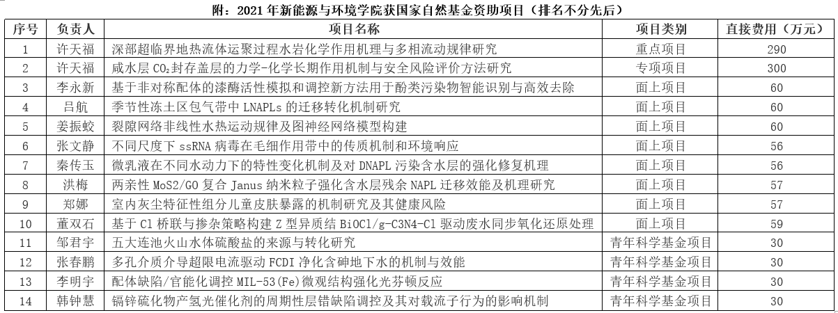 许天福教授主持申报的“深部超临界地热流体运聚过程水岩化学作用机理与多相流动规律研究”重点项目获批直接经费290万元,是一色