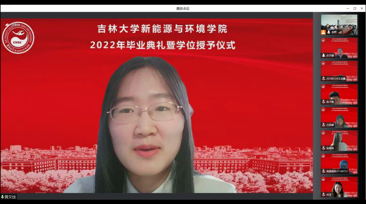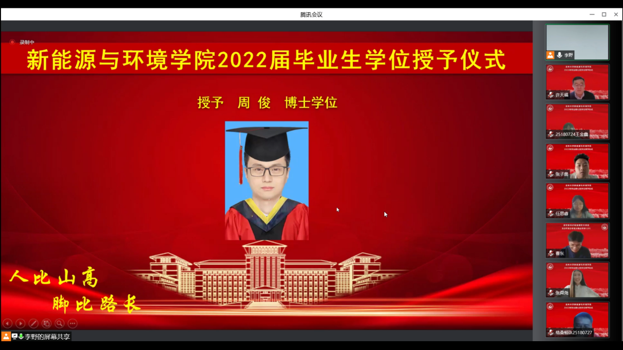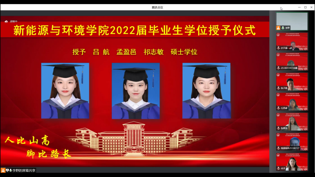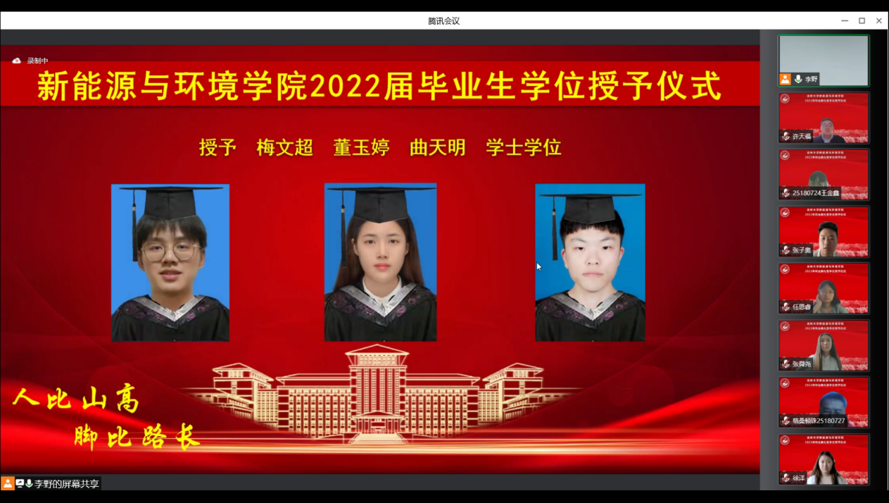 会议开始前,播放了毕业生在校期间的视频和照片,一幅幅照片、一个个镜头、一段段音乐勾起了老师和同学们美好的青春回忆。在师生们的期待与感动中,典礼正式开始。首先,全体起立奏唱《中华人民共和国国歌》。随后,花修艺教授和卞建民教授宣读了学院2022届毕业研究生和本科生名单,并对顺利毕业的同学表示祝贺。接着,同学们期待的学位授予仪式开始了,本次学位授予仪式采用线上制作动图的方式为毕业生拨穗。
