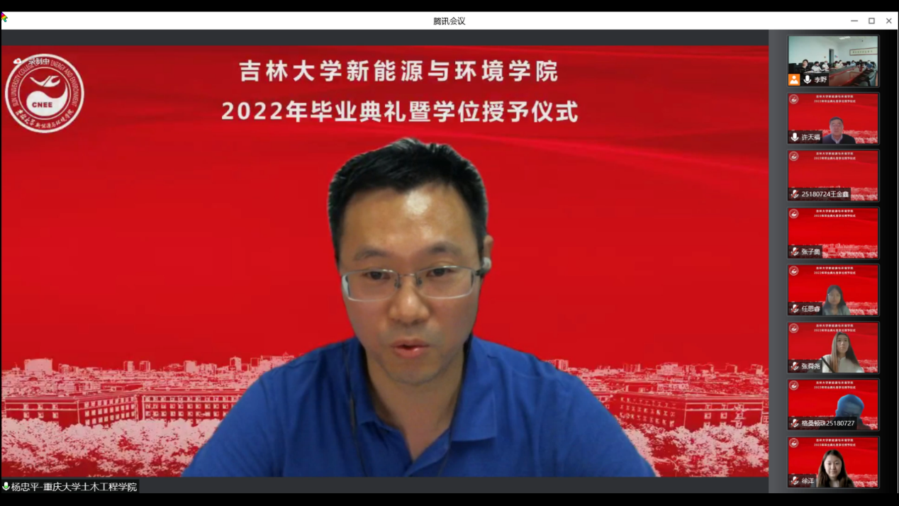召开了2022届毕业典礼暨学位授予仪式。本次毕业典礼采取线上线下相结合的方式,主会场设在前卫北区理化楼260会议室,同时采取腾讯会议的形式邀请全院师生及广大毕业生参加。线上会场的领导和嘉宾有:学院院长、学位评定委员会主任许天福教授,学院学术委员会主任赵勇胜教授,学院教学委员会主任董德明教授,校友代表重庆大学土木工程学院杨忠平教授,以及学院教职员工和2022届毕业生。线下会场到会的领导和同学有:学院党委书记汪祥松及领导班子成员,以及毕业生代表王涵同学等。毕业典礼由学院党委副书记温卓主持。