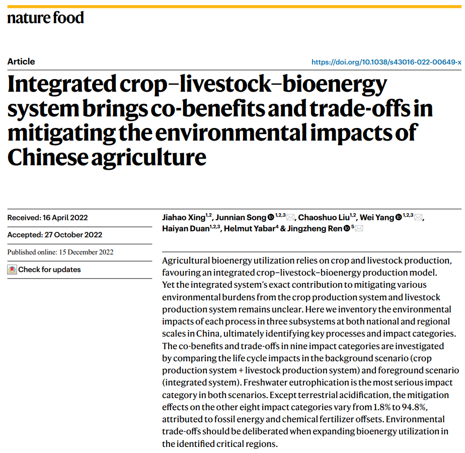 宋俊年教授研究团队领衔,与日本筑波大学、香港理工大学研究团队合作,在生物质能利用与农业环境影响研究领域取得重要进展,研究成果以“Integrated crop-livestock-bioenergy system brings co-benefits and trade-offs in mitigating the environmental impacts of Chinese agriculture”为题发表在农业与食物领域顶级期刊《Nature Food》。一色