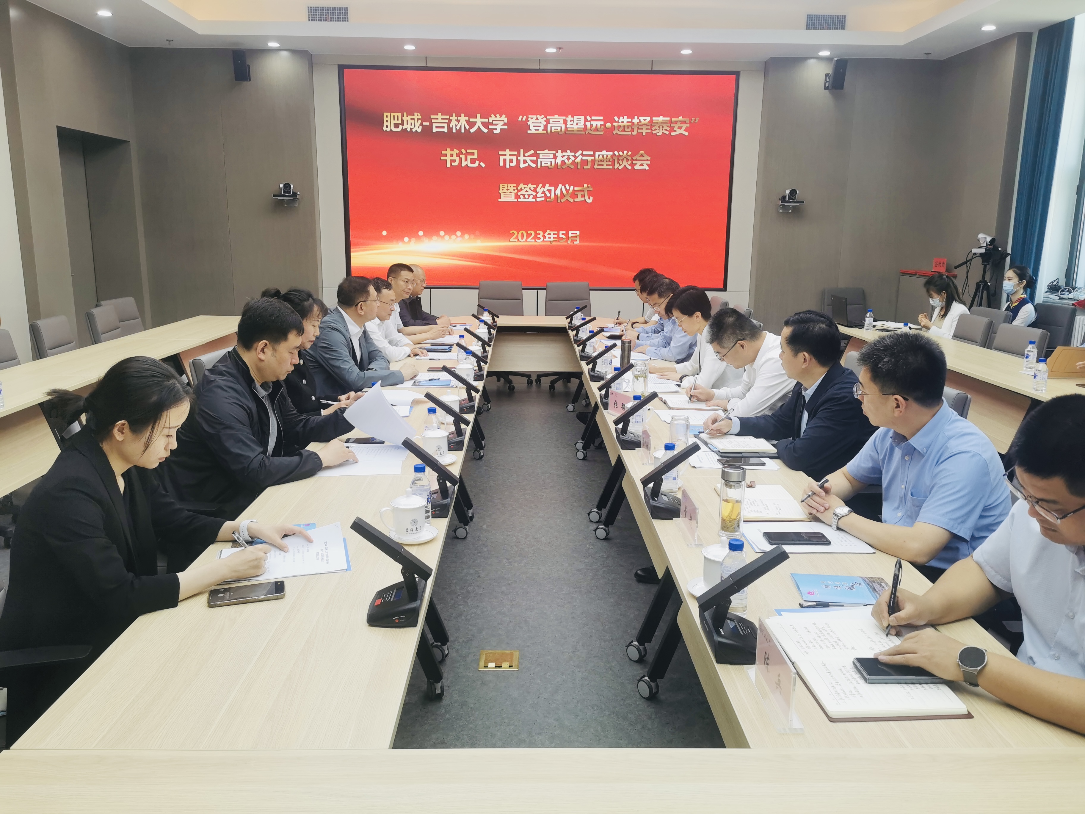,举行“登高望远·选择泰安”书记、市长高校行座谈会暨签约仪式,会议由国内合作处处长刘岩峰主持,肥城市市委书记张莉,一色