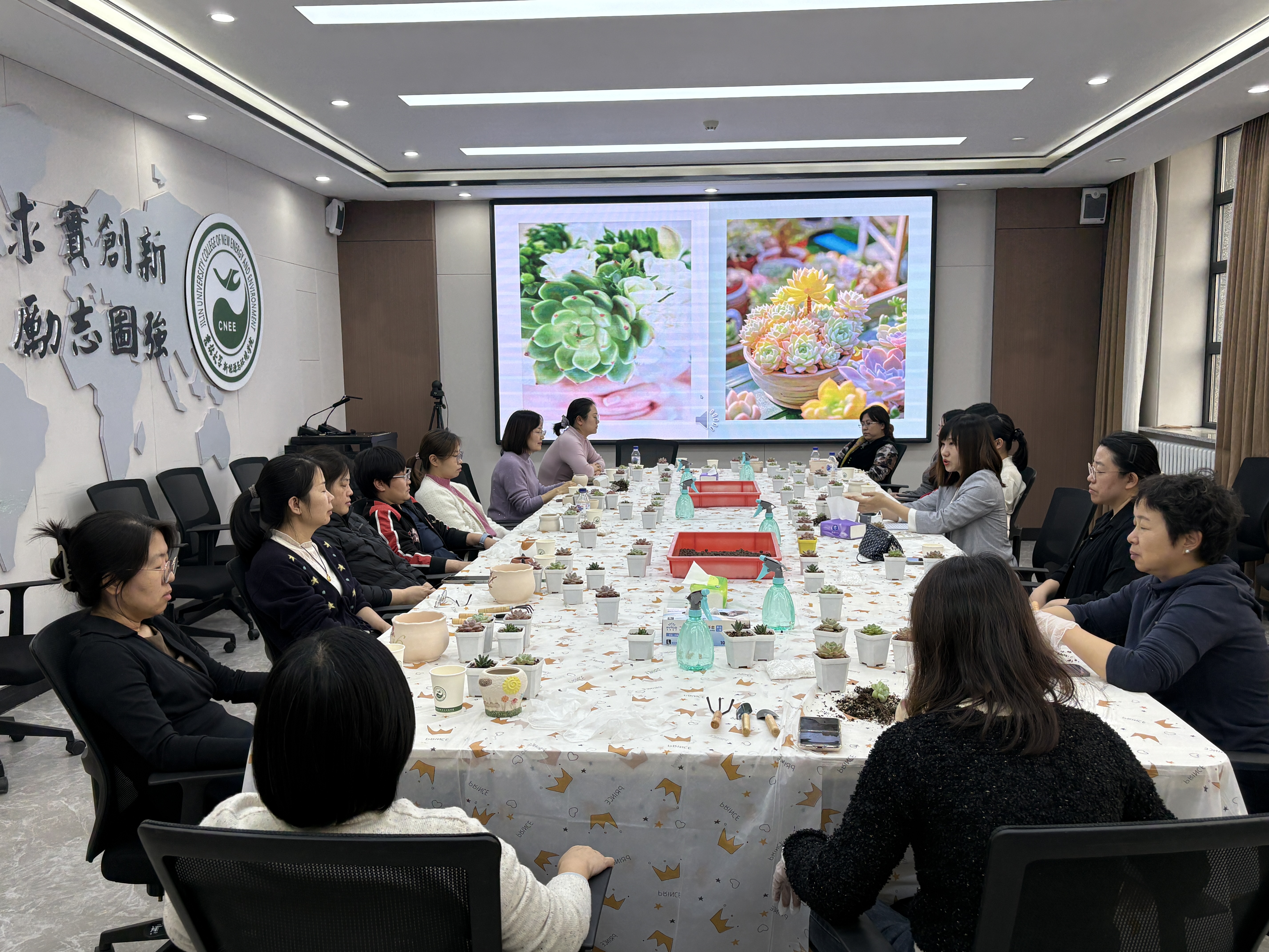 在多肉植物种植环节,学院提前准备了花土、陶粒、白石子及各类园艺工具。兰岚老师现场示范种植技巧,教职工们亲手栽种属于自己的多肉盆栽。活动现场欢声笑语,一盆盆生机勃勃的多肉植物在老师们手中焕发出活力。