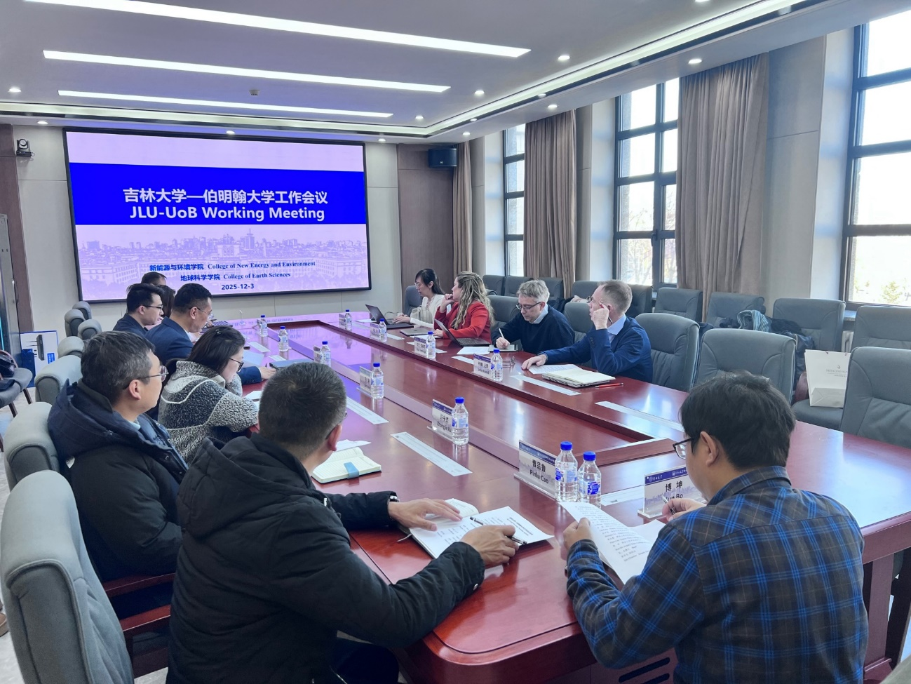 理化楼540会议室举行交流会,伯明翰大学代表团成员地理、地球与环境科学学院院长Nick Kettridege教授,生命环境科学学部全球事务负责人Heather Flowe教授,伯大-吉大中外合作办学事务负责人John Round教授,以及地理、地球与环境科学学院国际事务副主任Simiao Sun副教授;一色