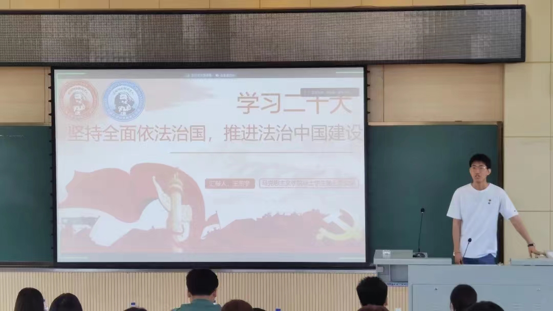 马克思主义学院三名硕士研究生以微党课的形式从全面依法治国、党章修订、人与自然和谐共生三个层面讲解以宪法为核心的中国特色化社会主义法律体系、党章的精髓要义以及人与自然和谐共生现代化理念的探索历程与科学内涵。